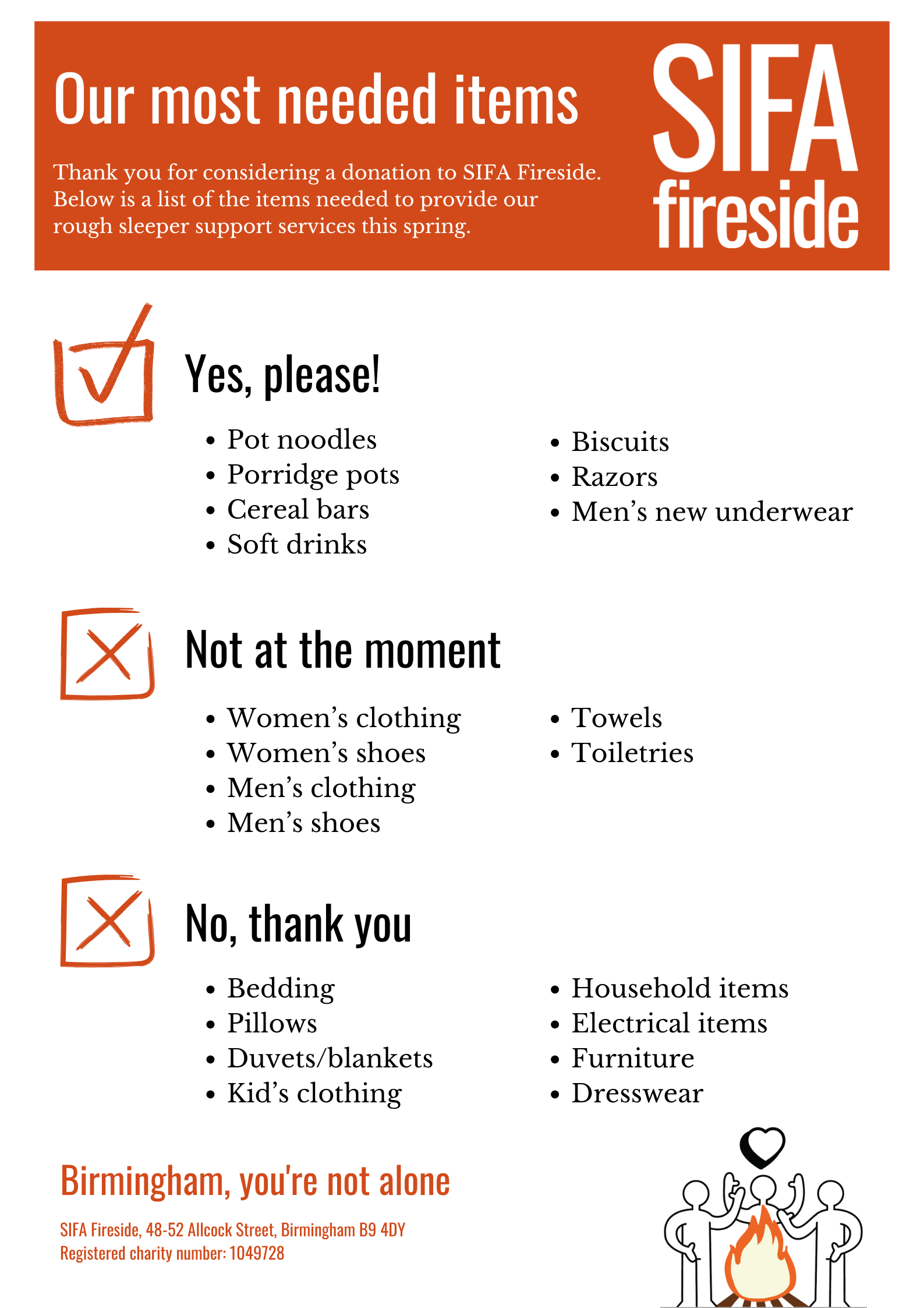 For clothing donations, please call the fundraising team to discuss our most-needed items on 0121 766 1700 (Monday – Friday, from 9am – 3pm).