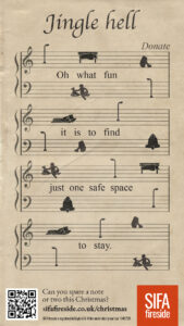 Jon Harrison, Co-founder and Creative Partner at One Black Bear, added: “It’s great, as an agency, to once again be supporting the vital work SIFA Fireside does in our city. The team thoroughly enjoy flexing their creative muscles (as well as singing voices) on these campaigns and we hope our little gift of an idea can help raise much needed funds and awareness for them and their cause.”